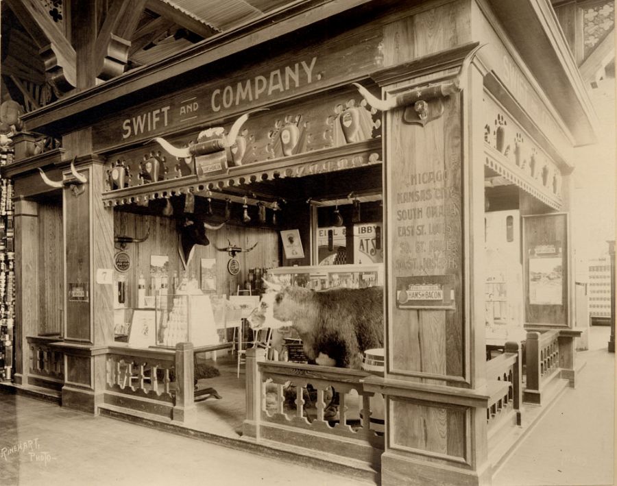 Interior of Manufactures Building. Swift and Company Hams and Bacon display by F. A. Rinehart, Center for Digital Research in the Humanities UNL-Libraries.