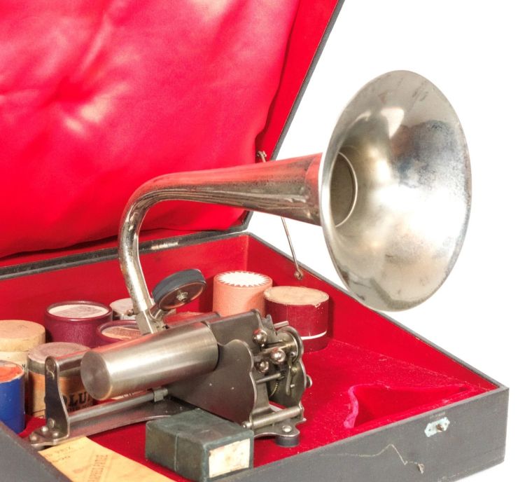 Pathe le Menestrel Cylinder Phonograph. Marketed by the mail order company J. Girard & Cie and initially available with a fixed carriage and a single mandrel, it was re-designed by Pathe in 1903 so that it could play both salon and standard sized cylinders. (Courtesy TechnoGallerie).