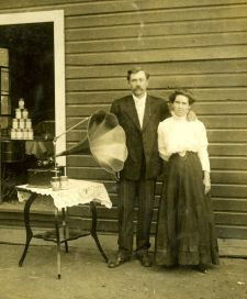 Tom and Mary Combs with Edison Standard 1909 (PM-0671). A sewing machine can be seen inside the doorway with Edison cylinder record boxes stacked on. |