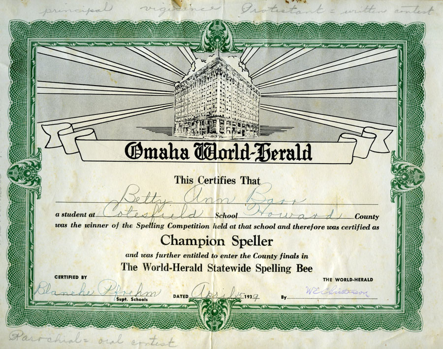 Ann Barr as Champion Speller, April 15, 1939.