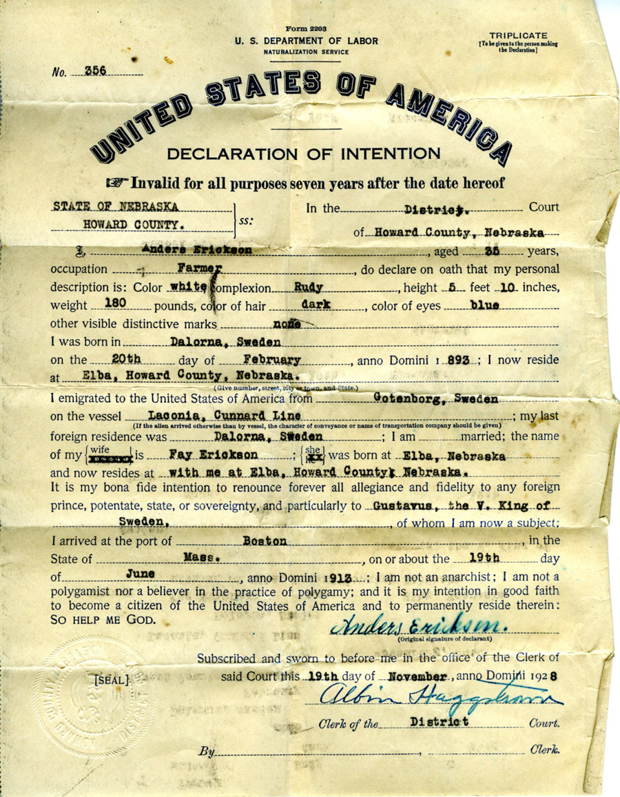 November 19, 1928 Declaration of Intention
