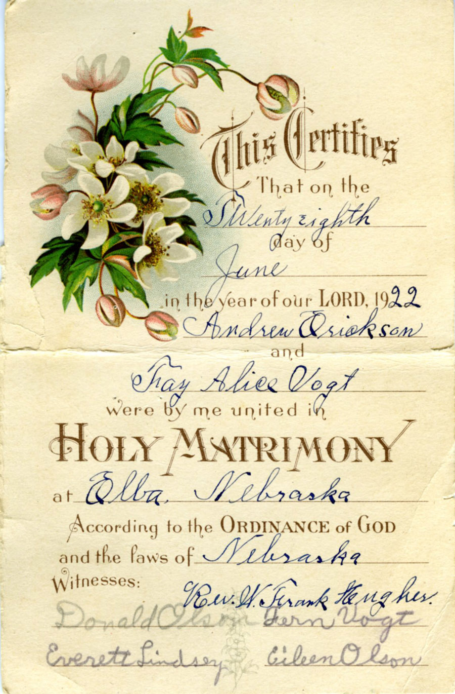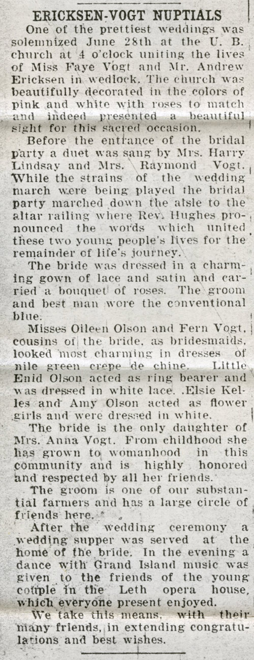 22, 1904 at Elba, Nebraska to Frank and Anna Ellen Ender Vogt.