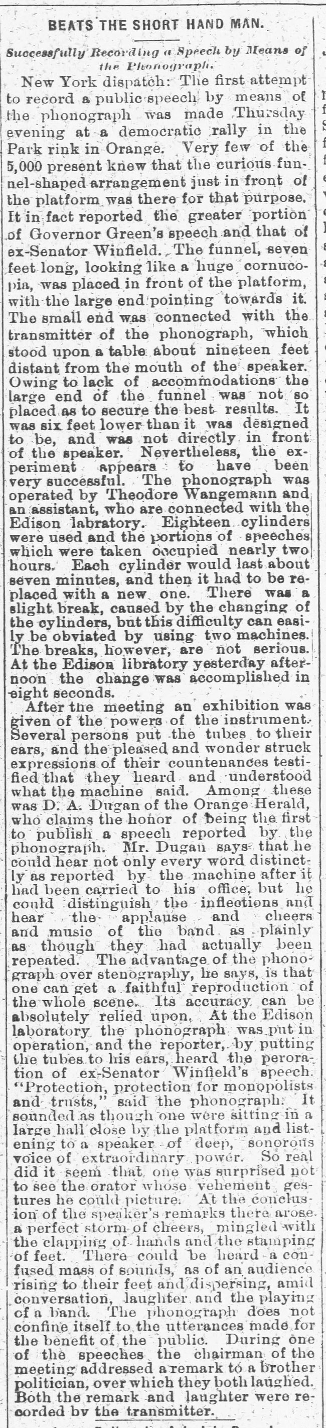 "BEATS THE SHORTHAND MAN." Successfully Recording a Speech by Means of a Phonograph.