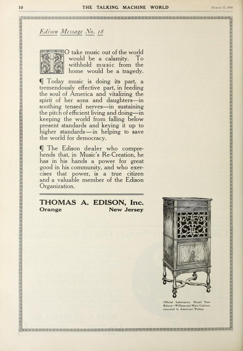 Edison Message No. 18, The Talking Machine World, March 15, 1918