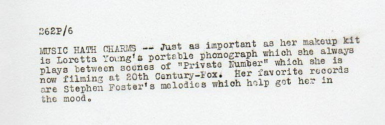 Loretta Young*, an honorary Friend of the Phonograph. A 1936 publicity photograph of Loretta Young taken between the scenes of "Private Number" had typed text pasted onto the back of the photo titled "MUSIC HATH CHARMS" which explains why Young has now been made an honorary Friend of the Phonograph: