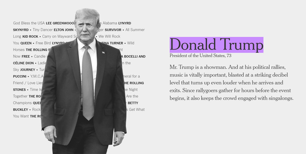 The music booms as people enter the rallies, and then candidates take the stage to a “walk-up” song that can become associated with their platforms. The New York Times analyzed playlists used by nine Democratic candidates and President Trump to see how they help set the tone for each campaign."