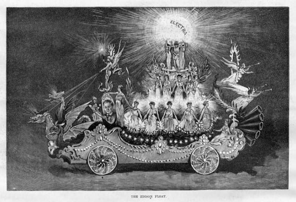 "They found much in the building to greatly interest them; great electric lenses used in lighthouses, the Edison electric column -- covered with five thousand electric globes -- and many other wonderful things; a beautiful scene in the daytime, but far more gorgeous at night, as they readily perceived that it would be; so they decided to pay a second visit after the lighting up that evening."