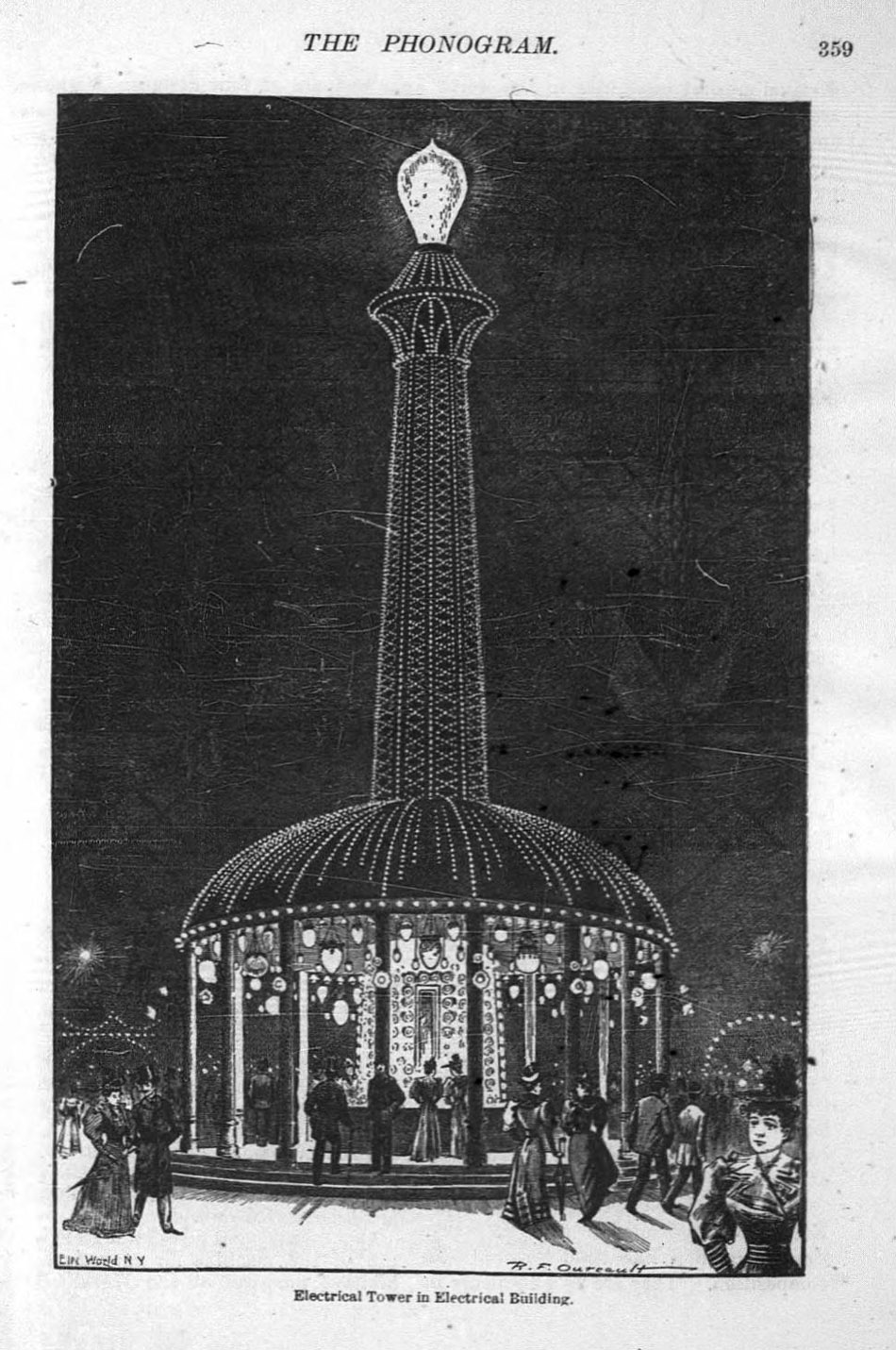 The Edison Tower of Light in the General Electric exhibit in the Electricity Building with its eight-foot tall light bulb at the top.