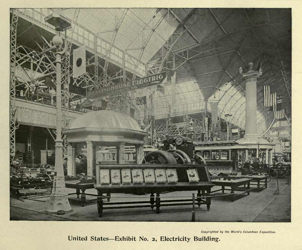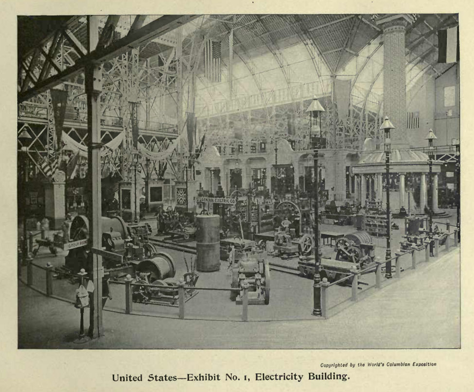 Electricity Building, United States Exhibit No. 1 showing General Electric Co. exhibit area and Edison Tower of Light. "Shepp's World's Fair Photographed, p. 221.