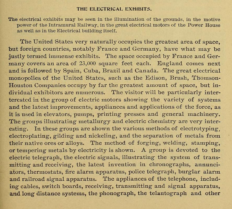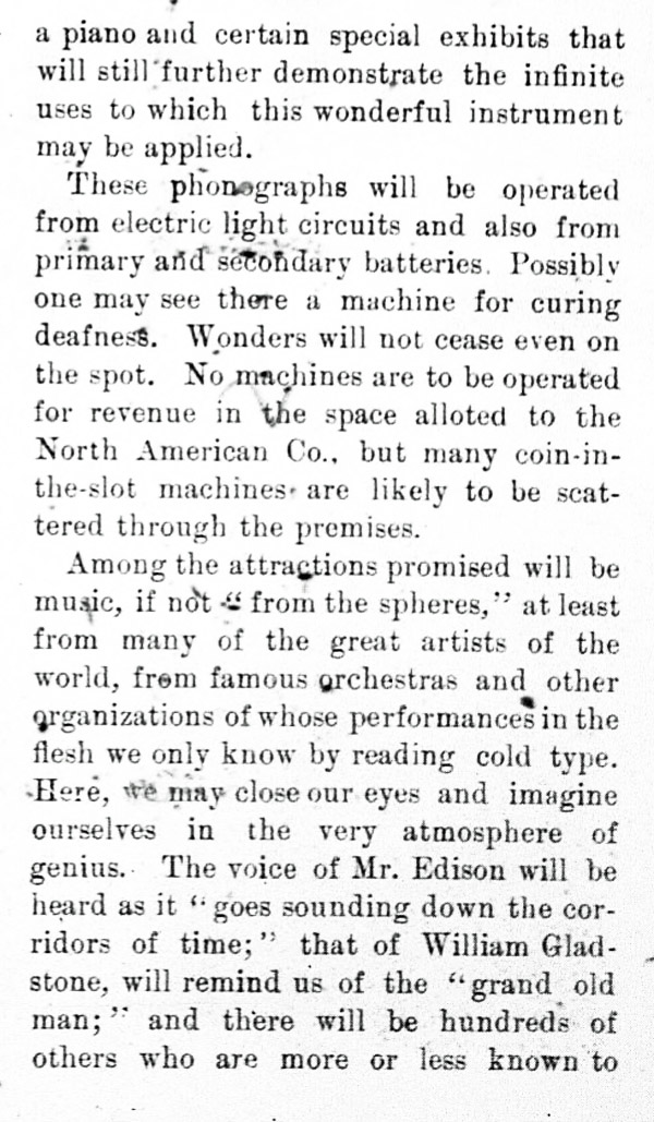 "The great Electricity building is filled with curious exhibits of an electrical character. To the left as you enter from the north front a large circular space is devoted to phonographs, where one at the expense of a few coppers may amuse himself for an hour."