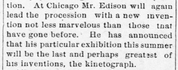 Tribune wrote that Edison was working on perfecting his kinetograph