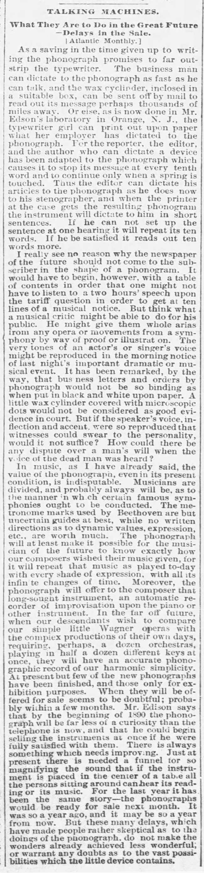 "TALKING MACHINES. What They Are to Do in the Great Future," The Daily Examiner, San Francisco, February 24, 1889, p.14