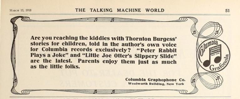 Kiddie stories "told in the author's own voice." Columbia records, The Talking Machine World, March 15, 1918