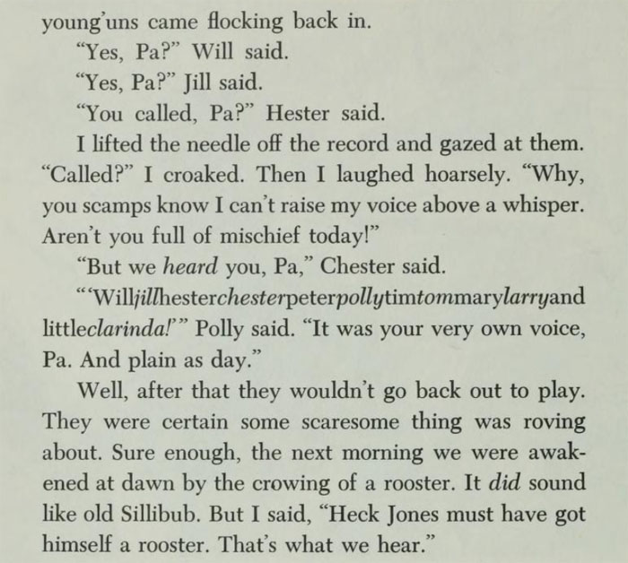 The following year an even more uncommon cold winter came. It was a "dreadful cold winter" and in the Winter of the Big Freeze "some downright unusual things" happened. "Red barns for miles around turned blue with the cold." "One day the temperature fell so low that sunlight froze on the ground." Through it all the family listened to their talking machine and John Philip Sousa's band. "My, those piccolos did sound pretty!" But when the ghosts came back, to Mr. McGroom's great displeasure, they were even able to fool him into thinking he was hearing the piccolos from his talking machine. "Confound that haunt!" McGroom exploded. "Now it's imitating John Philip Sousa's entire marching band!"