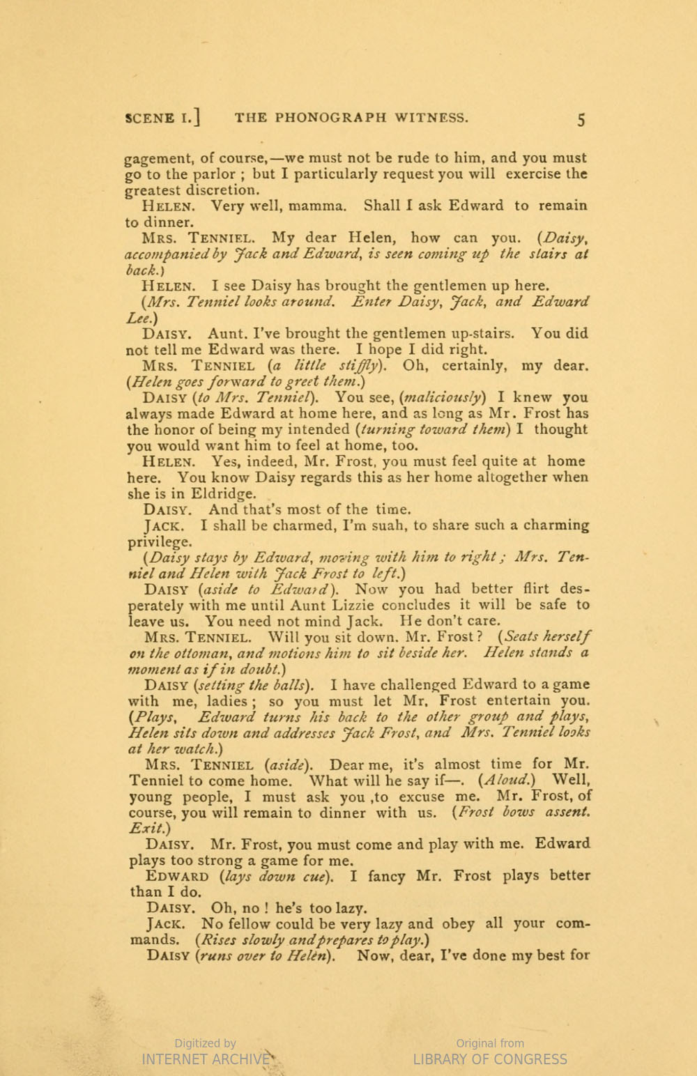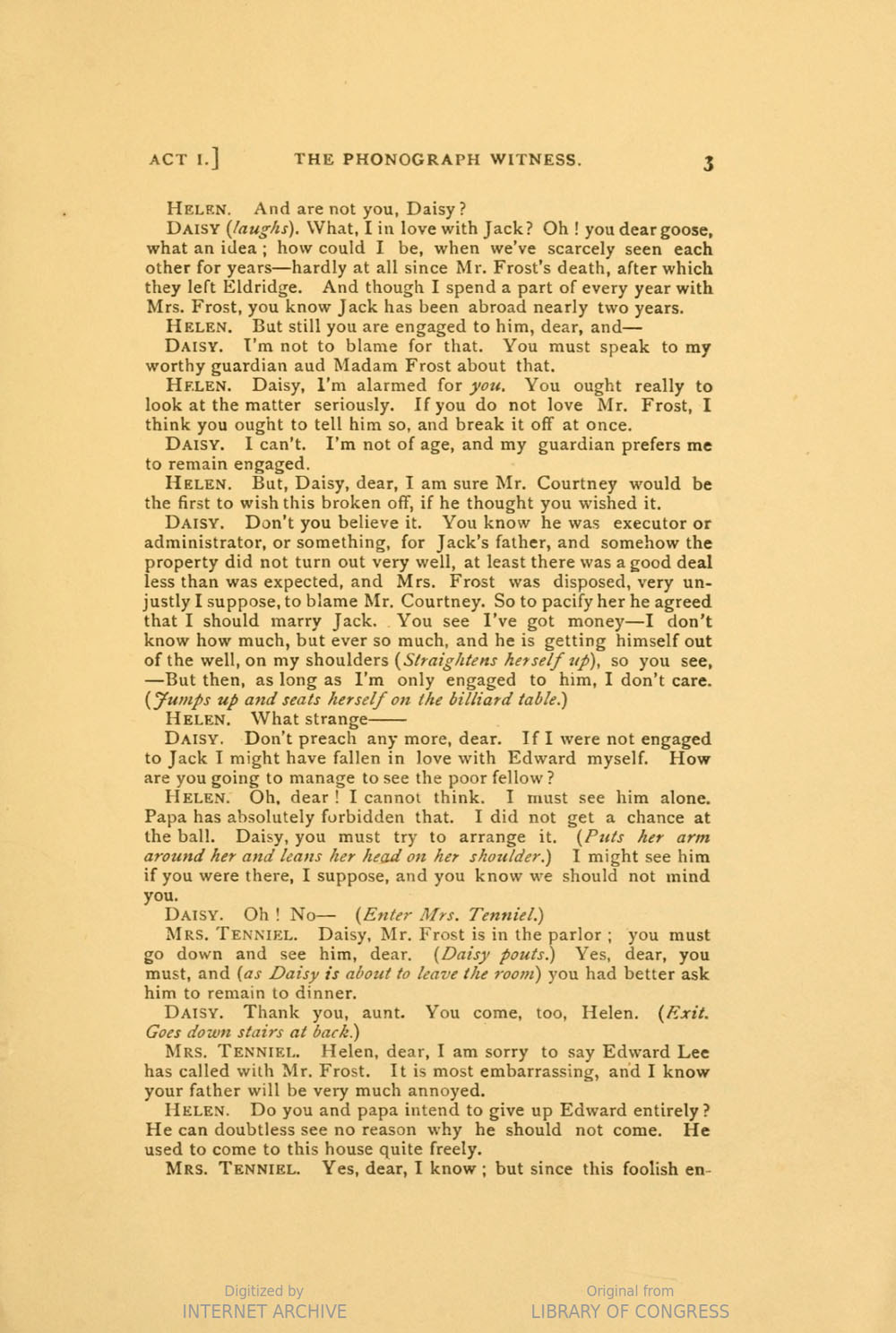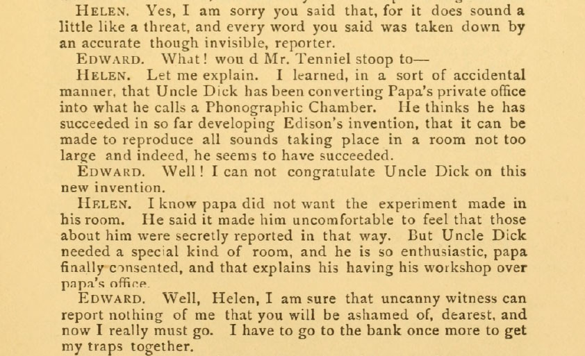 This five act drama was written by George W. Hill and deposited in the Library of Congress on November 6, 1882. It's a love story with the phonograph (only invented five years earlier and in reality still just a novelty) playing a role of "essential witness" in a murder trial. It's revealed in Act 1 that Helen's Uncle Dick has made her father's office a "Phonographic Chamber" where all sounds heard in that room are recorded by Uncle Dick's improved phonograph which is "an accurate though invisible, reporter" capable of being a "canny witness."