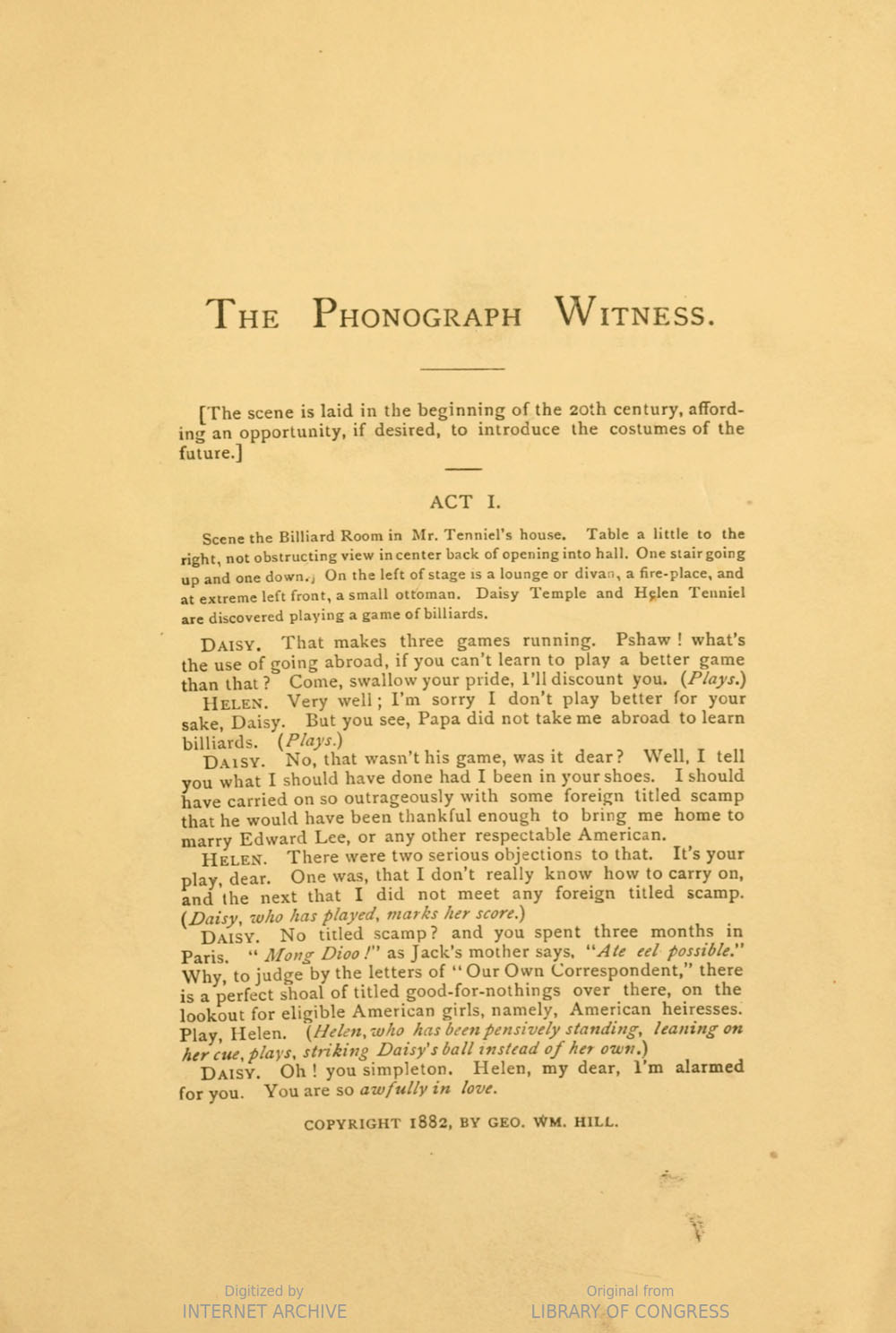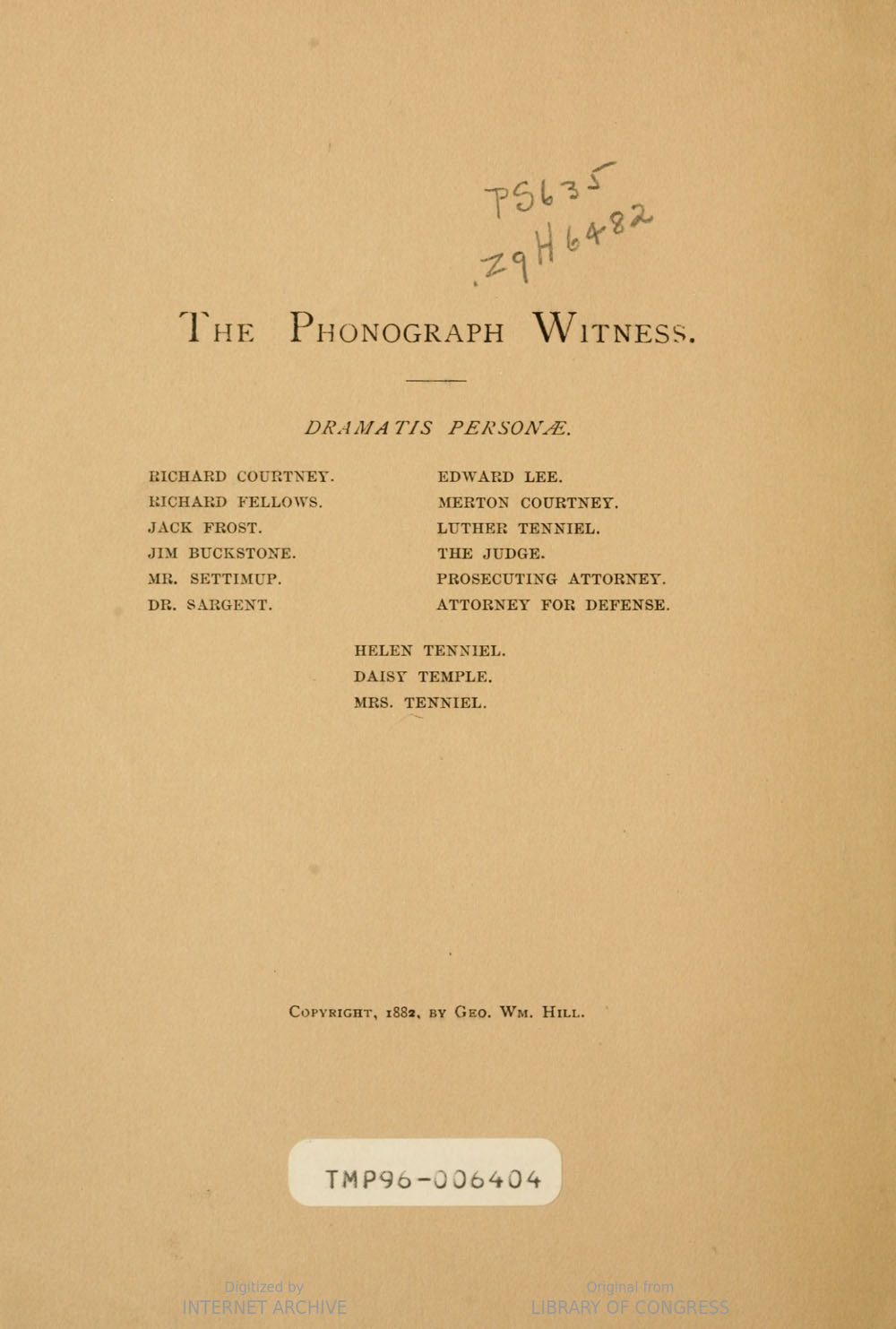 The Phonograph Witness. A Drama in Five Acts by George W. Hill, 1883