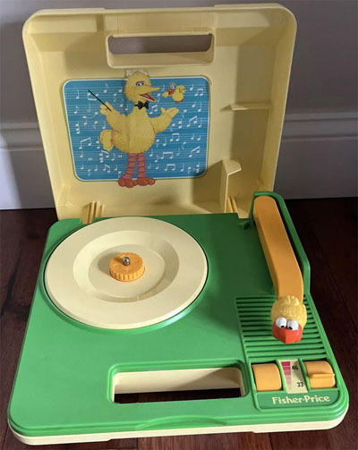 The Fisher-Price Record Player Model 815, featured Sesame Street's Big Bird playing 33 1/3 and 45 RPM records, c. 1984.