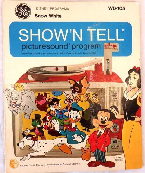The General Electric Show'N Tell picturesound program (record and slide) was a multimedia toy which played a number of stories on records synchronized with their slides. "Snow White" was one of the Disney programs offered for the GE "Youth Electronics Product."