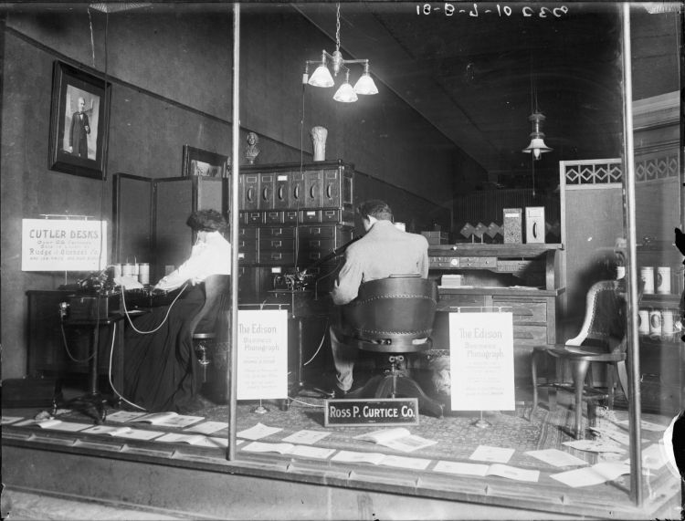 Ross P. Curtice Company, Lincoln, NE, July 8, 1910. Window interior advertising the Edison Business Phonograph. (Photographed by George E. Condra, 1869-1958, Courtesy History Nebraska.)