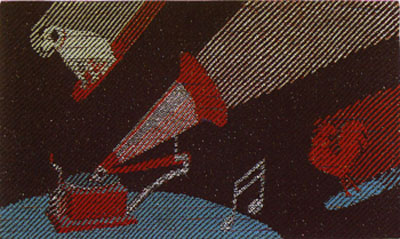 a disc record. The rival Pathe Rooster flies by on another record.The