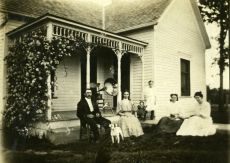 Billings Family portrait with Phonograph. Allen Billings family photographed outside their house with doll and Phonograph on chair - morninglory horn with flowers, ca. 1910. (PM-0025) |