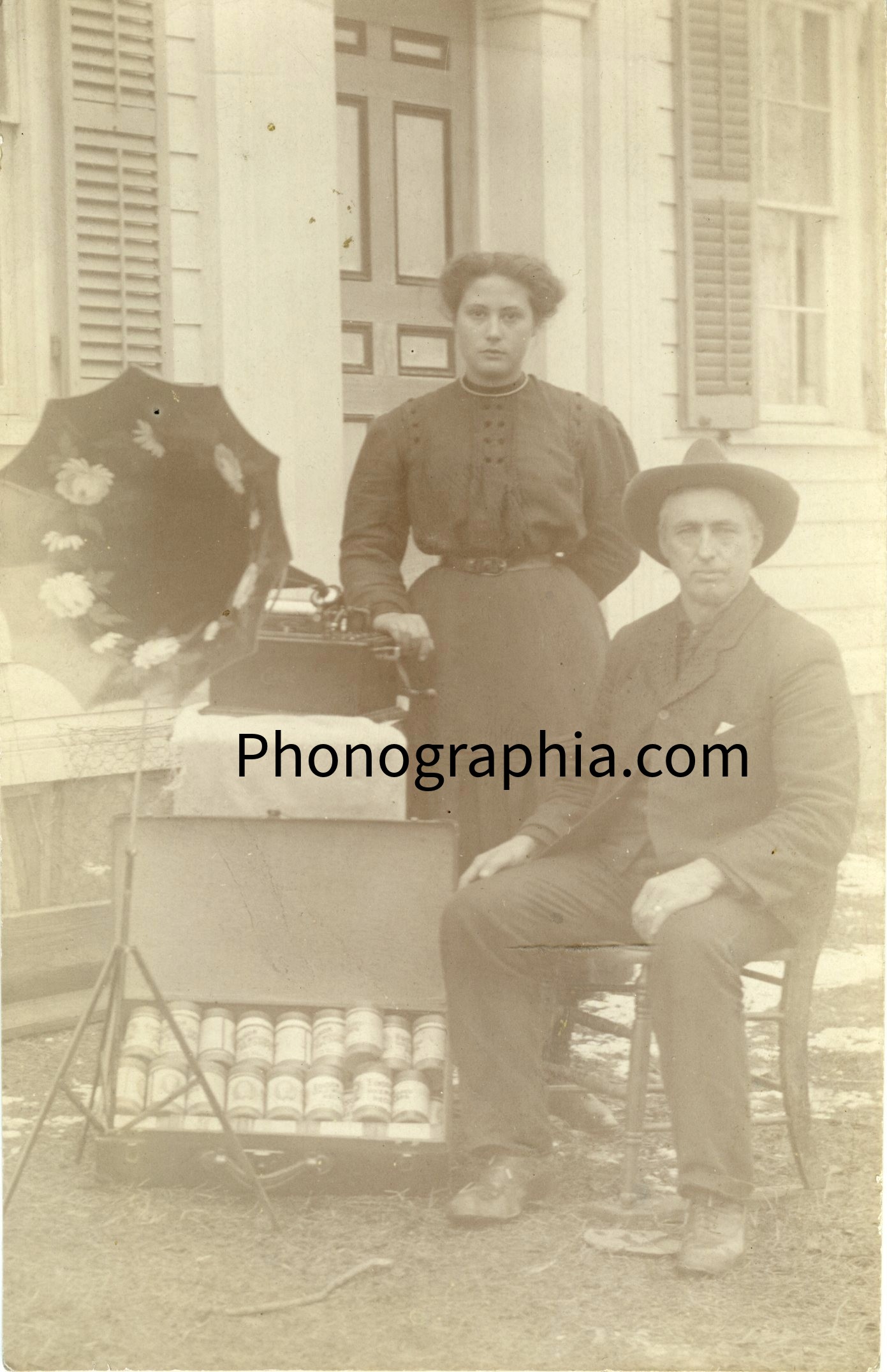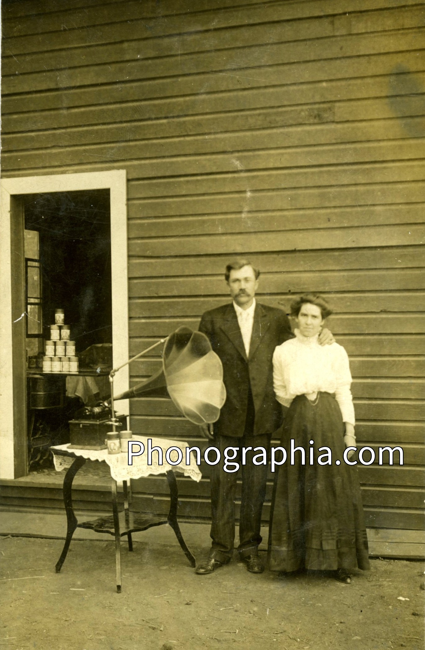 Tom and Mary Combs with Edison Standard 1909 (PM-0671). A sewing machine can be seen inside the doorway with Edison cylinder record boxes stacked on. | ||||