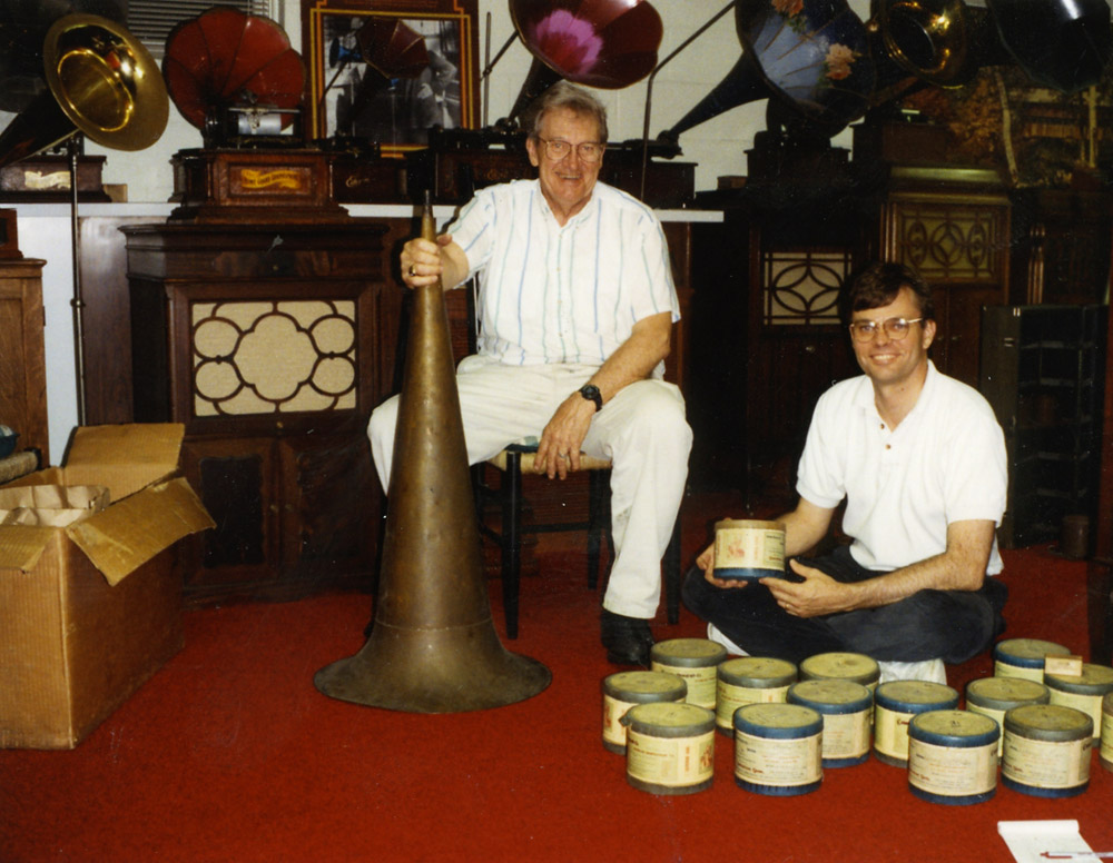 Axel and Doug Boilesen in the basement of 544 Lyncrest following the acquisition of a Columbia Home Grand with Grand cylinder records. (Photo circa 1993)