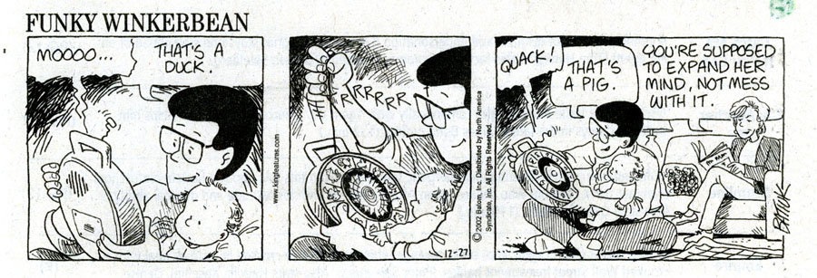 The father's humor is a bit questionable (as the mother correctly questions what's so funny about trying to confuse a baby?). But if you grew up in this era you can probably still hear the distinctive sound of pulling the chatty-ring and remember the variety of the See 'N Say talking toys.